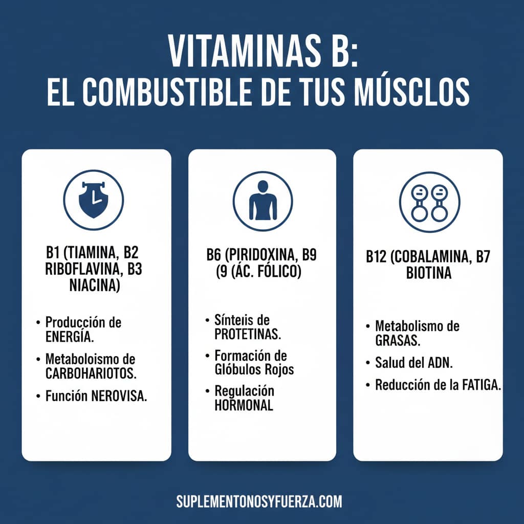 Las vitaminas B (B1, B2, B3, B5, B6, B9, B12) son cofactores esenciales en el metabolismo energético. Sin ellas, tu cuerpo no puede convertir eficientemente los carbohidratos, grasas y proteínas en energía.